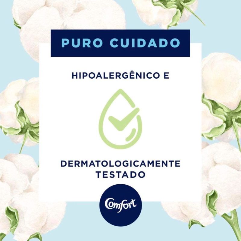 Este amaciante não apenas amacia, mas também confere um frescor que se mantém mesmo após várias lavagens. Com ele, suas roupas não só ficam mais macias, como também exalam um aroma agradável que é perfeito para qualquer ocasião. O uso regular do Comfort Tradicional Puro Cuidado garante uma fragrância envolvente que vai acompanhar você ao longo do dia, trazendo uma sensação de limpeza e frescor a cada uso.