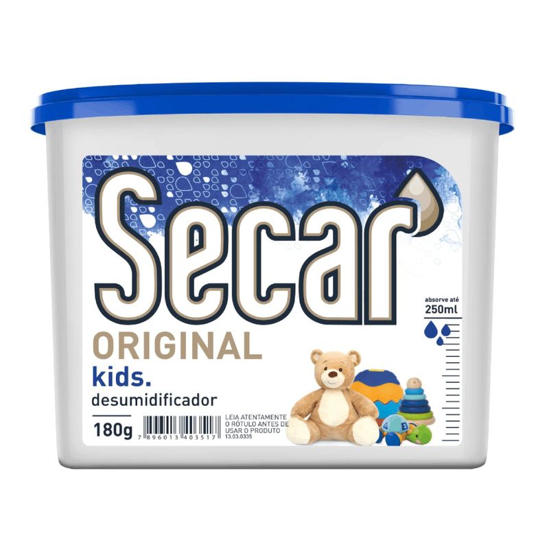 Desumidificador Secar Original Kids 180g – Conforto e Saúde para os Pequenos Ambientes Mais Saudáveis para Crianças O desumidificador Secar Original Kids é ideal para criar um ambiente saudável para os pequenos. Com o objetivo de manter a qualidade do ar em quartos, salas de jogos e outros espaços usados pelas crianças, esse aparelho é um aliado eficaz contra a umidade excessiva. Ao controlar a umidade do ar, ele ajuda a prevenir a formação de mofo, bolor e ácaros, garantindo um espaço mais seguro e confortável. Tecnologia e Funcionalidade O modelo de 180g oferece um desempenho confiável, absorvendo a umidade de forma contínua e silenciosa. Com um design atrativo que remete ao universo infantil, o desumidificador se torna parte da decoração do ambiente, mantendo sempre uma estética agradável. É uma ferramenta prática que, além de funcional, também contribui para o bem-estar das crianças, proporcionando um ar mais seco e fresco. Uso Prático e Eficiente O Secar Original Kids é fácil de acomodar em qualquer lugar e pode ser utilizado em diversos cômodos da casa. Seu funcionamento não requer energia elétrica, tornando-o uma opção econômica e sustentável para o controle da umidade. A troca do produto é simples e rápida, garantindo que você não precise se preocupar com manutenções complicadas. Segurança e Confiabilidade Pensando na saúde e segurança das crianças, o desumidificador é livre de componentes químicos, promovendo um uso seguro e saudável. Você pode ficar tranquilo sabendo que seu funcionamento não irá impactar de maneira negativa o ambiente dos pequenos. Com ele, você contribui para um lar mais saudável e confortável de forma prática e segura.