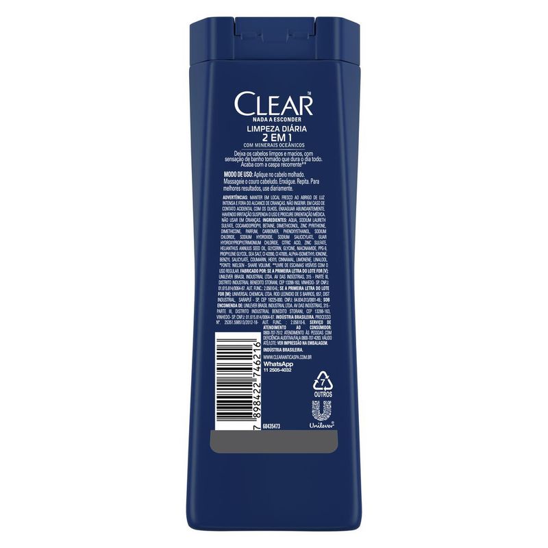 Com minerais oceânicos, Deixa os cabelos limpos e macios, com sensação de banho tomado que dura o dia todo. Amino ácido é conhecido como proteína essencial para o crescimento saudável do cabelo e nutre o couro cabeludo. Acaba com a caspa que insiste em voltar*, enquanto nutre o couro cabeludo e deixa o cabelo saudável. Recomendado para couro cabeludo ressecado e para rotinas com muita estilização (uso de pomadas e ceras). Preparação perfeita é uma das chaves do sucesso. No entanto, a exposição frequente a tratamentos químicos pode danificar o cabelo e o couro cabeludo, o que pode levar a uma caspa. Desenvolvido para homens, porque o couro cabeludo do homem está mais propenso a caspa, o Shampoo Anticaspa CLEAR Men Limpeza Diária 2 em 1 com mineirais oceanicos, deixa os cabelos limpos e macios, com sensação de banho tomado que dura o dia todo. Formulado com Bio-booster, a nova tecnologia inteligente de Clear que alia a expertise no cuidado com o couro cabeludo e a expertise no cuidado com a pele, o Shampoo Anticaspa CLEAR Men Limpeza Diária 2 em 1 ajuda a ativar a proteção natural do couro cabeludo e acaba com a caspa que insiste em voltar*, nutrindo o couro cabeludo, dando-lhe cabelos saudáveis para o visual perfeito. Seu aroma revigorante mantém uma sensação de frescor e limpeza o dia todo. Modo de uso: aplicar no cabelo molhado. Massageie o couro cabeludo. Enxágue. Repita. Para melhores resultados, use diariamente. Advertências: manter em local fresco ao abrigo de luz intensa e fora do alcance de crianças. Não ingerir. Em caso de contato acidental com os olhos, enxaguar abundantemente. Havendo irritação suspenda o uso e procure orientação médica. Não usar em crianças. *livre de escamas visíveis com o uso regular.