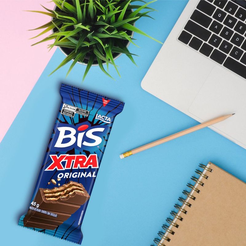 Compre agora a Caixa de Bis XtraOriginal ao Leite 45g. Bis Xtra é a combinação perfeita do wafer recheado com uma deliciosa cobertura de chocolate ao leite. Com 45g é o snack ideal para ter na mochila, na despensa de casa ou na gaveta do escritório para quando bate aquele descontrole por doce! Compre já! Tabela Nutricional e Alergênicos: Veja a tabela nutricional e ingredientes nas imagens. Produto com Alto Teor de Açúcar Adicionado e Gordura Saturada.